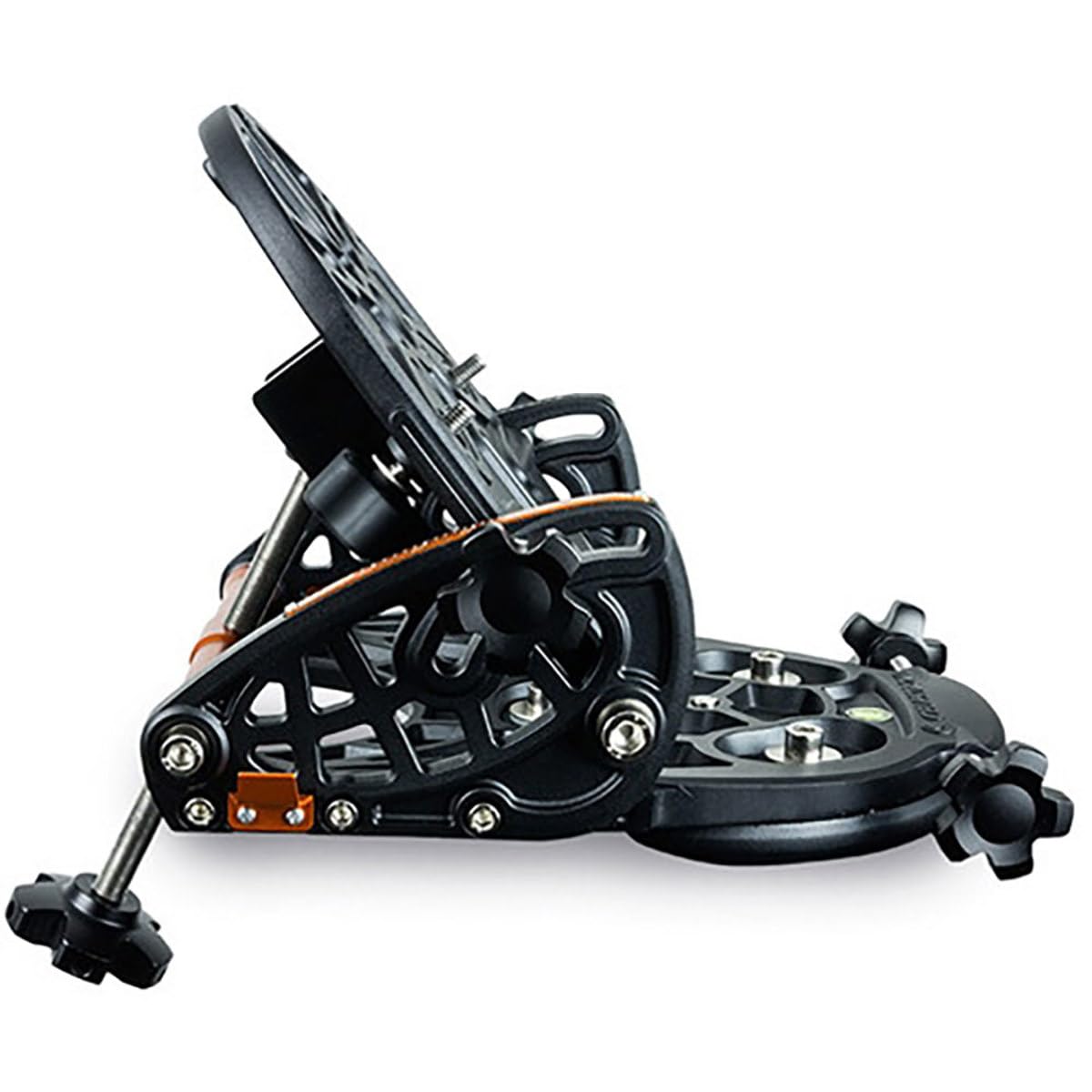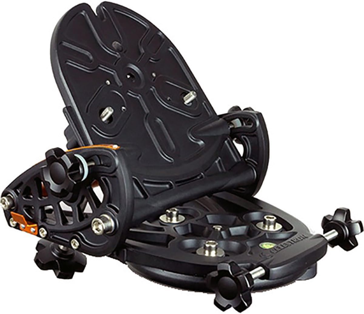 Equatorial wedge for Celestron NexStar 6/8SE and Evolution Alt-Az mounted computerized telescopes. Enables long exposure astrophotography and autoguiding by tilting the telescope’s azimuth into an equatorial platform allowing it to track an arc around the polar axis.