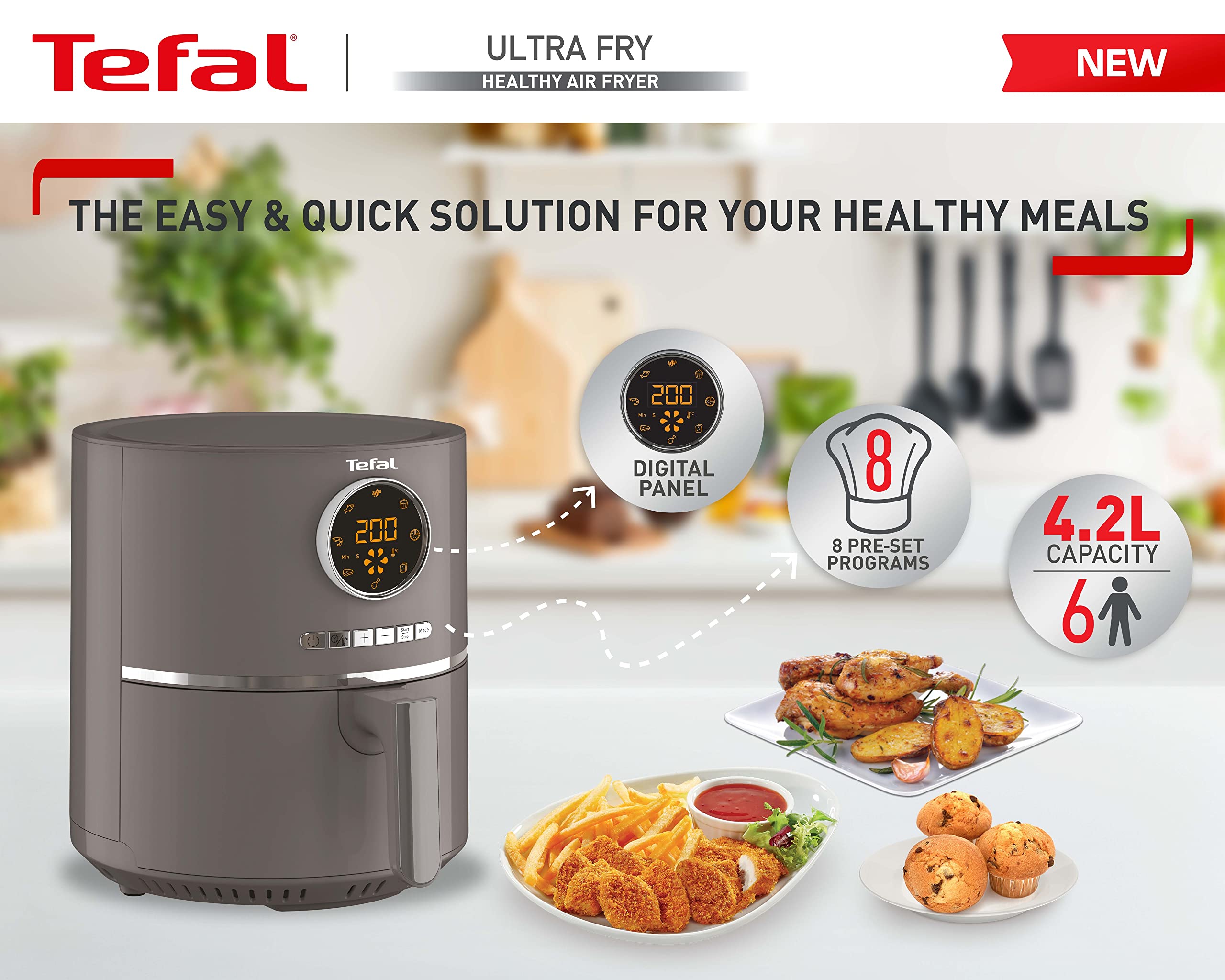 Tefal Ultra Fry (Digital) - Air Fryer - 4.2 Liters Capacity - 8 Programs - EY111B15 Prepare healthy and delicious meals that everyone will love, with little to no oil! The Ultra Fry is the quick and easy air fryer solution that requires no preheating, by Tefal. Perfect for an active lifestyle, this versatile hot air fryer ensures golden, crispy results on a wide variety of tasty dishes, with 8 preset programs including fries, cakes, pizzas, toast, chicken, meat, shrimp and fish. Its 4.2 liters capacity is ideal, while convenient features like adjustable temperature control and a 60-minute timer combine cooking precision with convenience. Rounding is an intuitive and easy to use design. With Ultra Fry, enjoy a single appliance for endless recipes!.