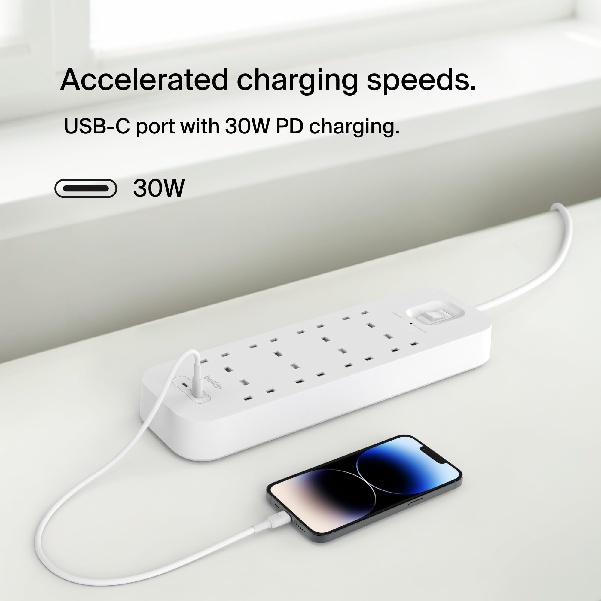 مشترك بلكين بثمانية مخارج كهربائية مع حماية من زيادة التيار خيارًا مثاليًا لتشغيل وحماية أجهزتك الإلكترونية بأمان وكفاءة. يحتوي على 8 منافذ كهربائية ومنفذين USB-C مع خاصية الشحن السريع PD لشحن عدة أجهزة في وقت واحد -دامج بوكس