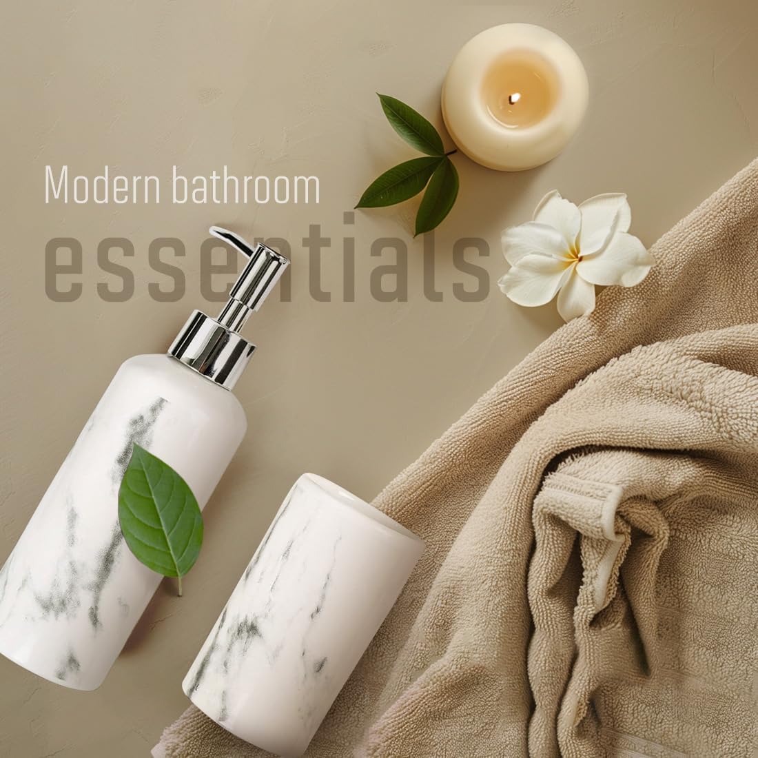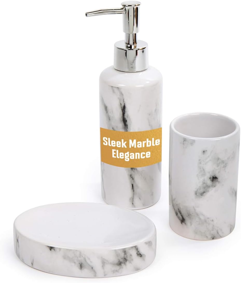 أضف لمسة من الأناقة والرقي إلى حمامك مع مجموعة الحمام المصنوعة من السيراميك بتصميم رخامي عصري. تحتوي المجموعة على موزع صابون أو لوشن بمضخة بلاستيكية متينة تشبه الكروم، وطبق صابون، وحامل فرشاة أسنان. تضفي الطباعة الرخامية العصرية على كل قطعة من المجموعة مظهرًا جميلًا ينسجم بسهولة مع ديكور حمامك. بالإضافة إلى كونها خيارًا رائعًا لحمامك الخاص، تُعد هذه المجموعة هدية مثالية لأعياد الميلاد، أو حفلات الزفاف، أو المناسبات الخاصة، أو الانتقال إلى منزل جديد.