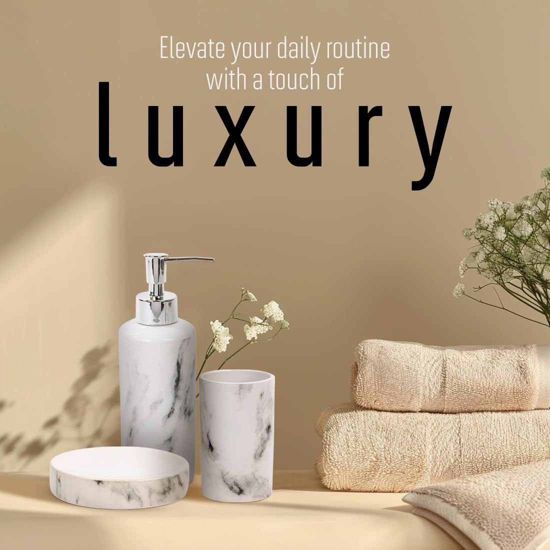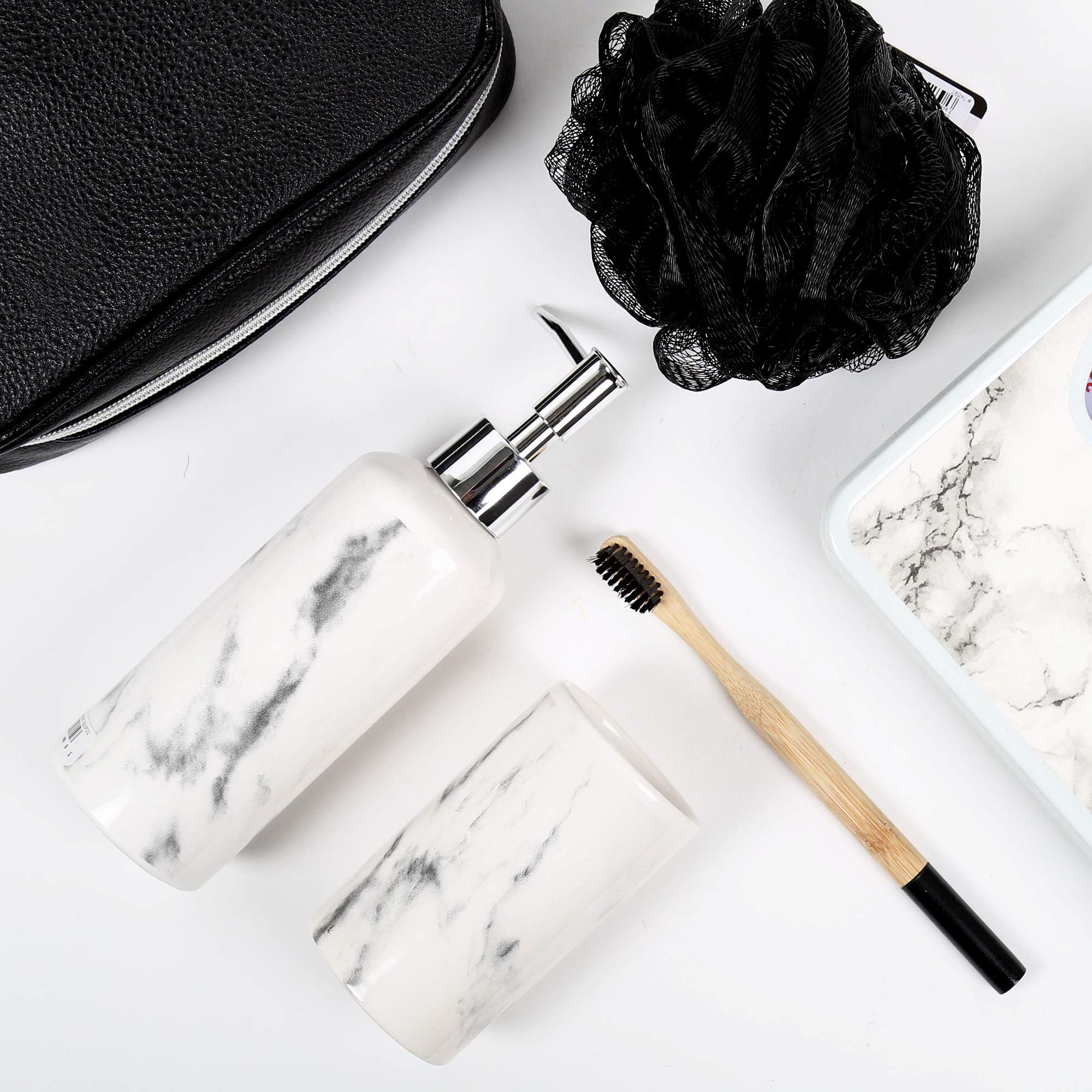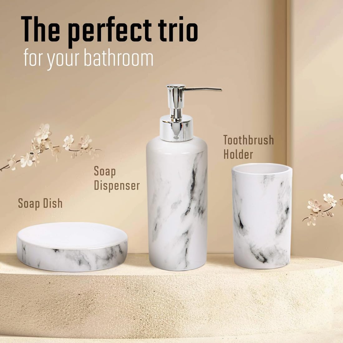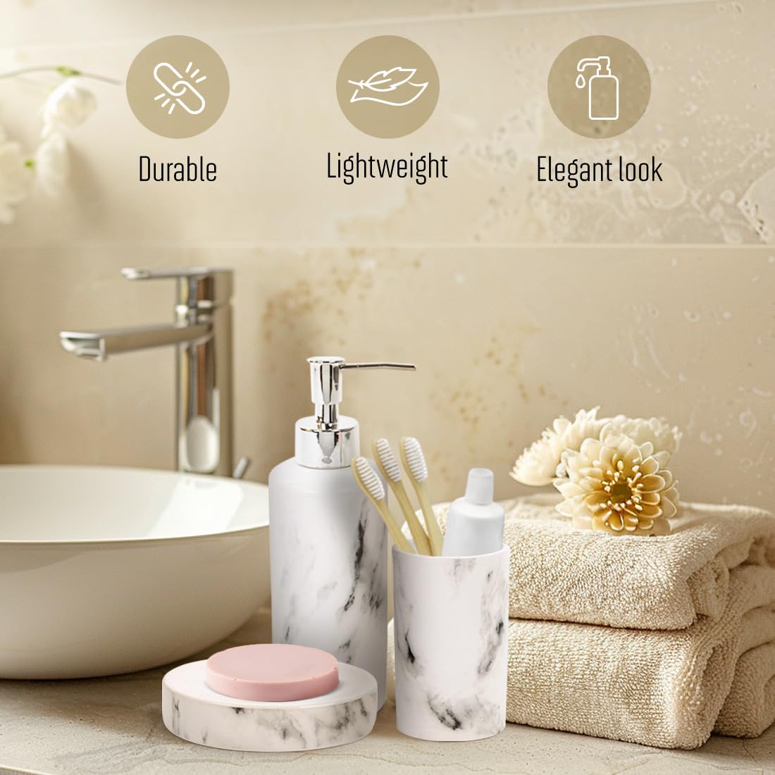 * **مجموعة مثالية:** تتضمن مجموعة إكسسوارات الحمام موزع صابون، وطبق صابون، وحامل فرشاة أسنان.