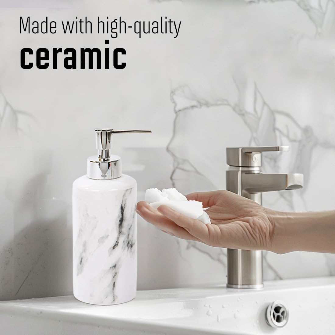 * **مادة متينة:** مصنوعة من السيراميك عالي الجودة والمتين والأنيق، مع مضخة بلاستيكية لامعة تشبه الكروم على موزع الصابون، لا تصدأ ولا تتآكل.