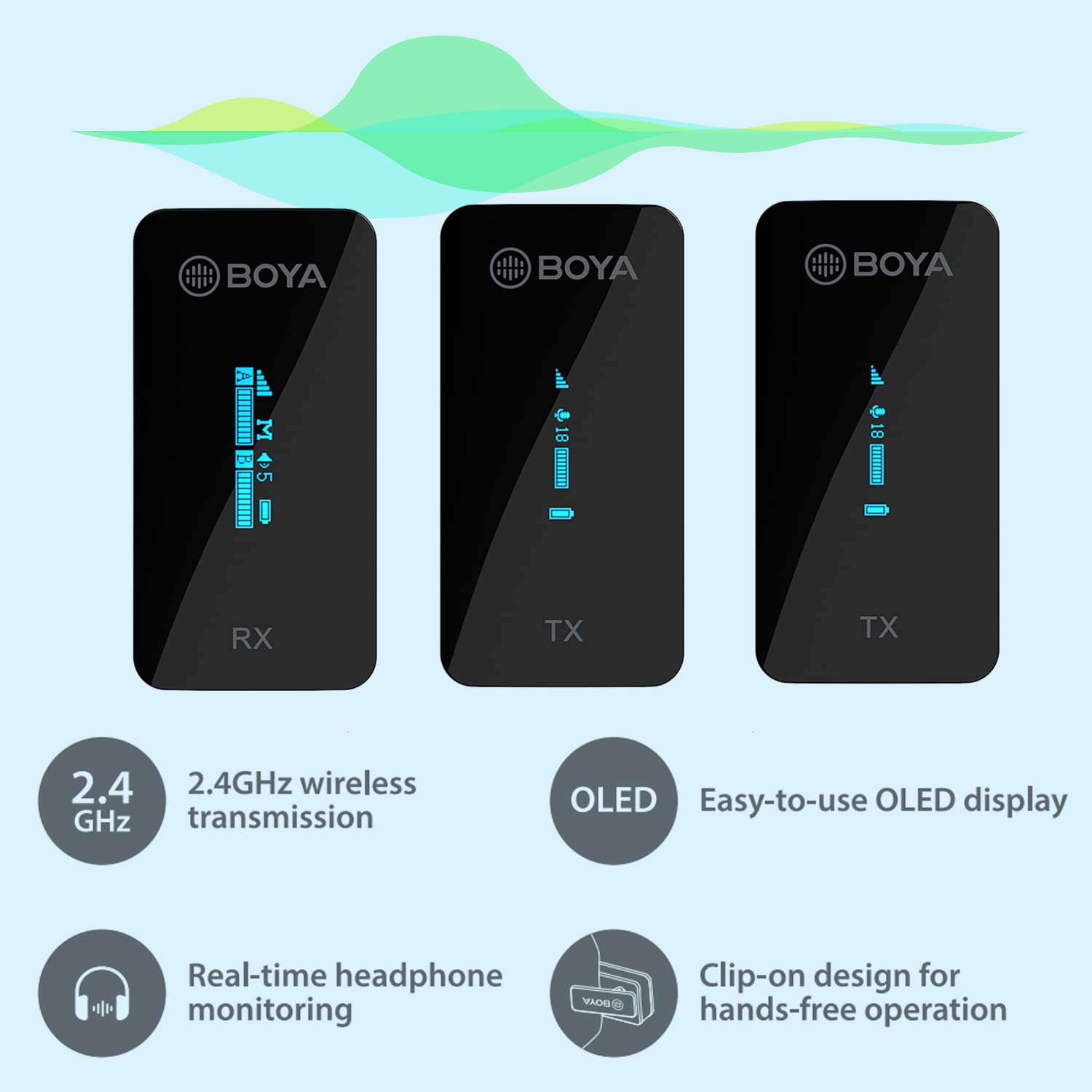 نظام BOYA BY-XM6 هو ميكروفون لاسلكي مزدوج القناة بتردد 2.4 جيجاهرتز، يتكون من وحدتي إرسال ووحدة استقبال واحدة. يعد حلاً مثالياً لالتقاط الصوت بجودة عالية لمقاطع الفيديو الثنائية مثل الفلوغات، مقاطع اليوتيوب، البث المباشر، المقابلات والتسجيلات الصوتية.