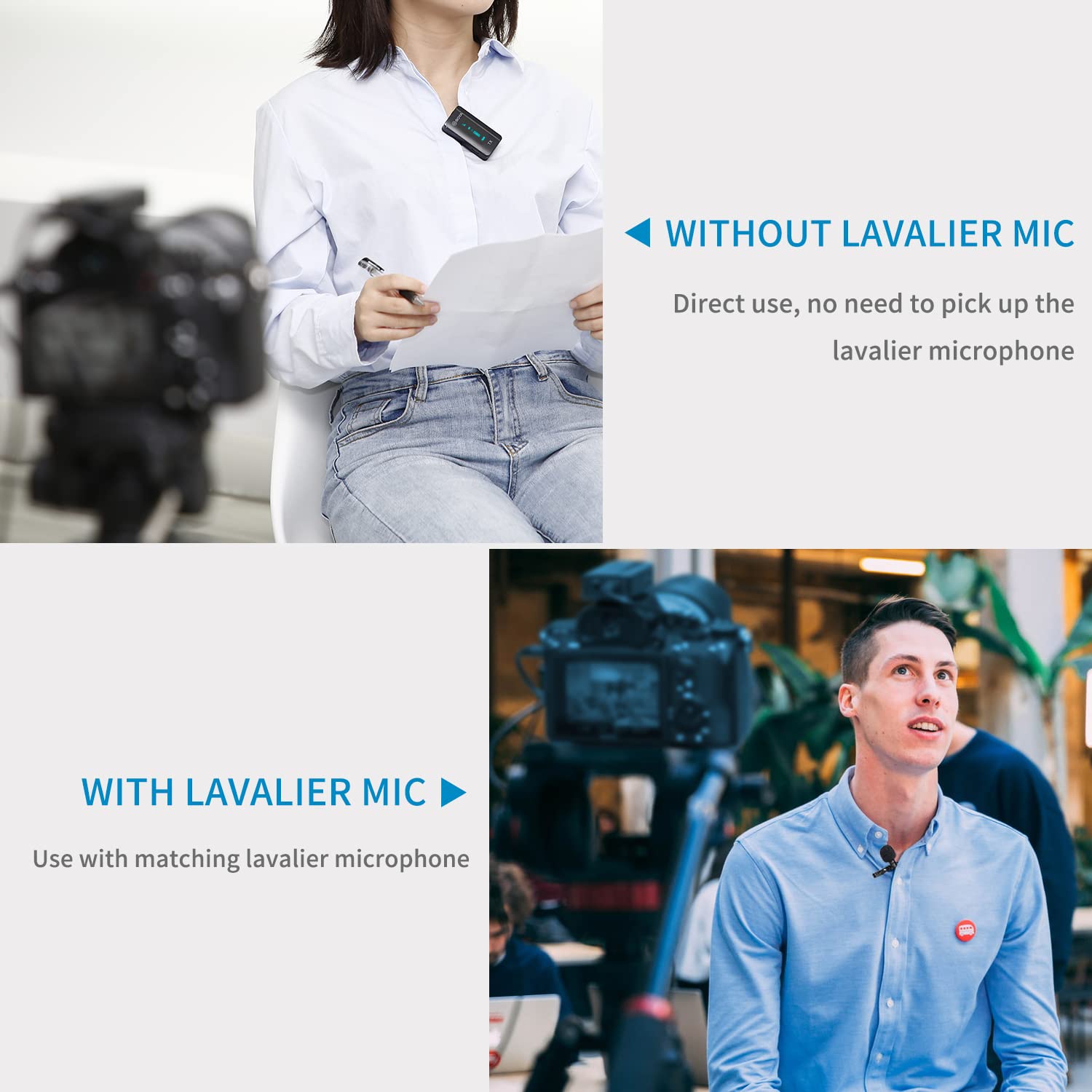 ويمكن للمستخدمين تثبيت جهاز الإرسال مباشرة على الياقة بفضل الميكروفون المدمج، أو توصيل ميكروفون لافالير إضافي عبر منفذ MIC IN للحصول على تسجيل أكثر احترافية.