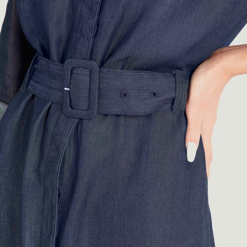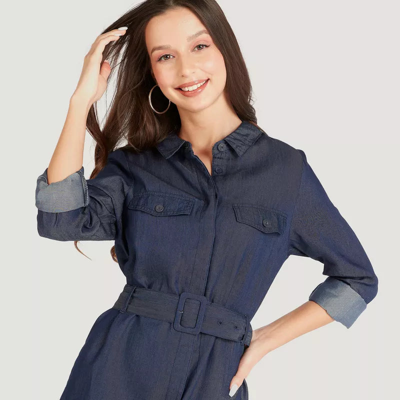 فستان واسع دنيم بحزام وأكمام طويلة