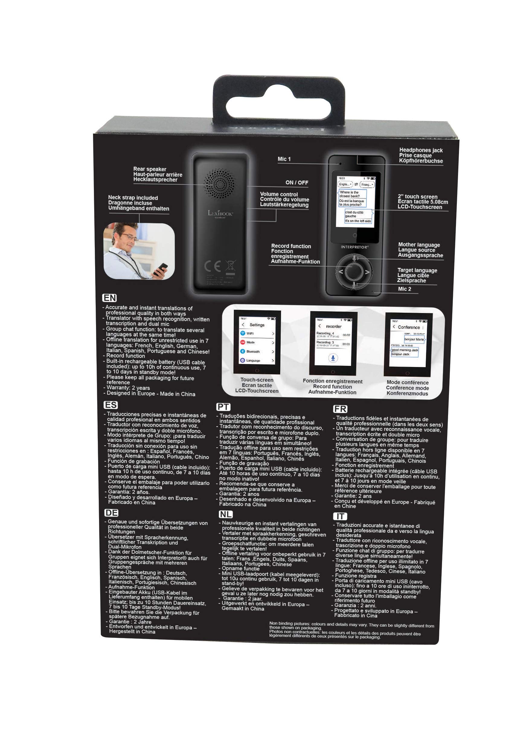 يُعد مترجم ليكسيبوك Interpretor® NTL2000 جهاز ترجمة فوري متطور مصمم للمسافرين والمهنيين ومتعلمي اللغات. يدعم 75 لغة ويوفر ترجمة دقيقة بجودة احترافية في الوقت الفعلي. يتميز بشاشة لمس سهلة الاستخدام واتصال بلوتوث وواي فاي لسهولة التواصل سواء وجهًا لوجه أو في المحادثات الجماعية. يتمتع بتصميم أنيق باللون الأسود، خفيف الوزن وسهل الحمل، مما يجعله الرفيق المثالي للتواصل بلغات متعددة في أي مكان حول العالم.