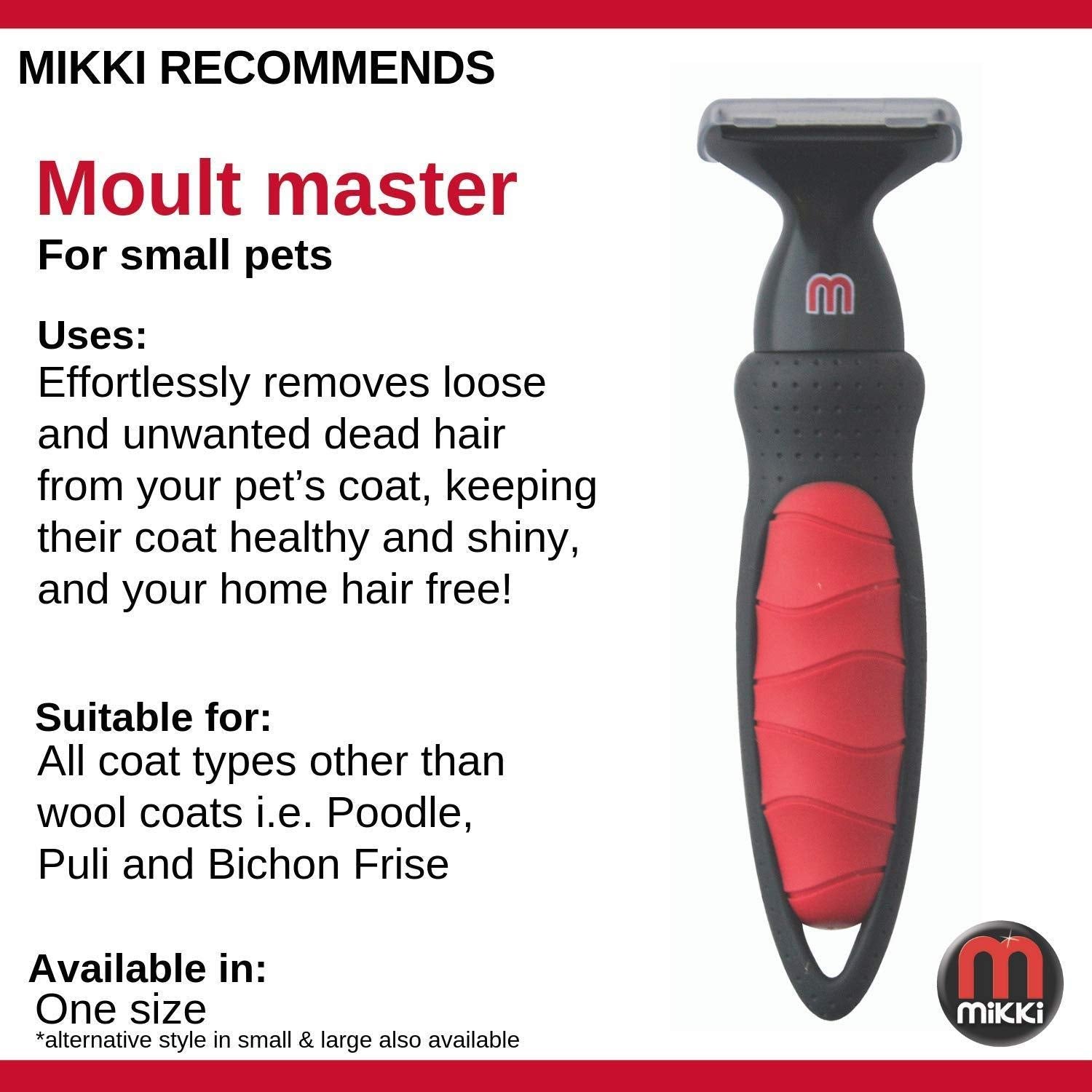 أداة ميكي للعناية بالحيوانات الأليفة – فرشاة إزالة الشعر الزائد (Moult Master) هي أداة احترافية مصممة لتقليل تساقط الشعر وإزالة الفراء الميت بسهولة. مناسبة للكلاب والقطط والجراء