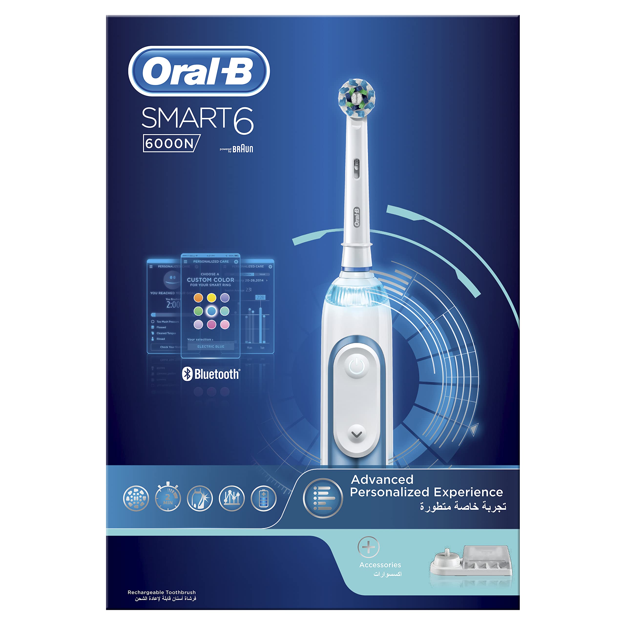 فرشاة الأسنان الكهربائية أورال-بي سمارت 6 6000N توفر تنظيفاً احترافياً للأسنان بفضل تقنيتها الذكية والتوجيه الشخصي. تتميز بتقنية Smart Coaching التي تتصل عبر البلوتوث بتطبيق أورال-بي لتتبع عادات التنظيف وتحسين العناية بالفم.