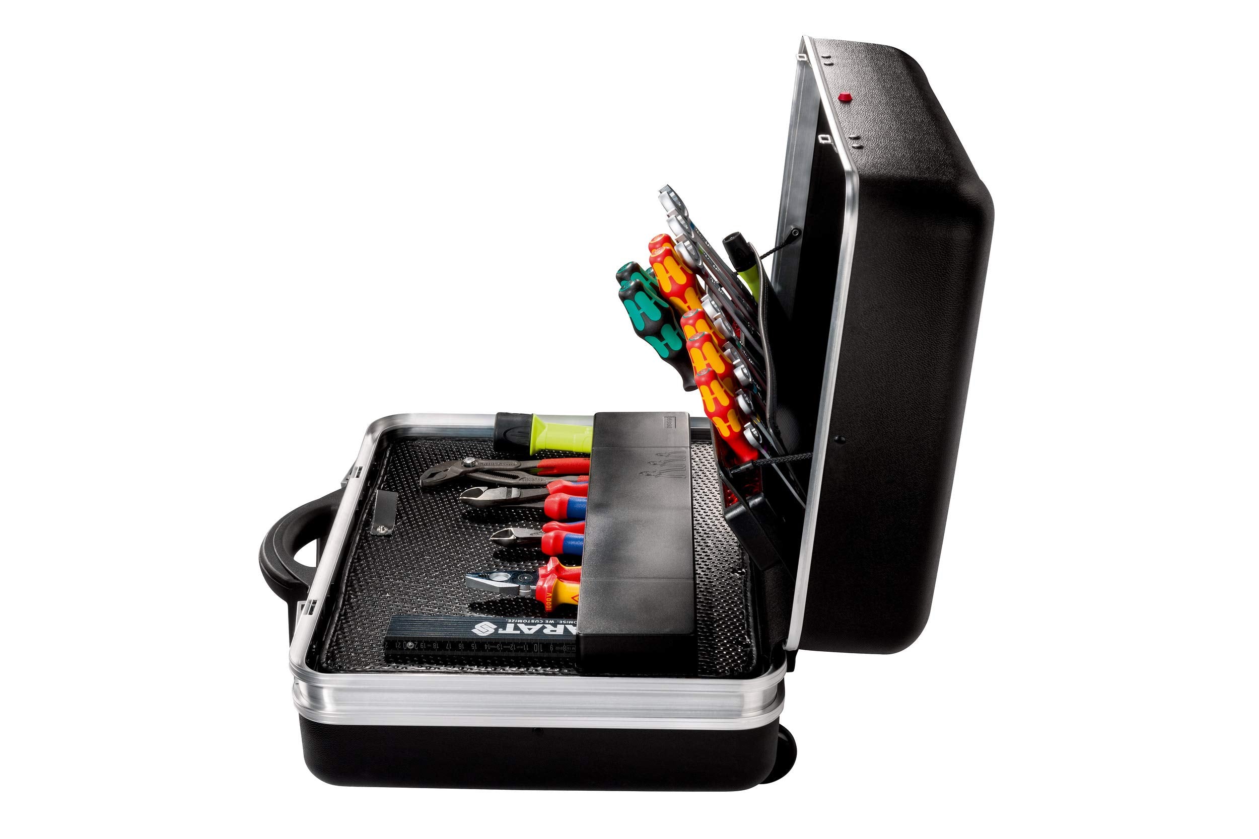 حقيبة الأدوات المتنقلة بارات Parat GmbH & Co. KG CP-7 Classic Safe Tool Case Roll (موديل 589550171) هي حقيبة عالية الجودة مصممة للمحترفين الذين يبحثون عن المتانة والتنظيم وسهولة النقل. تتميز بغلاف خارجي صلب ومتین باللون الأسود الأنيق، مما يوفر حماية ممتازة للأدوات أثناء التنقل. تحتوي على أقسام متعددة وألواح تثبيت للأدوات للحفاظ على تنظيمها وسهولة الوصول إليها. كما أن مقبض السحب والعجلات السلسة يتيحان تنقلاً سهلاً ومريحاً، مما يجعلها مثالية للفنيين والمهندسين والحرفيين.