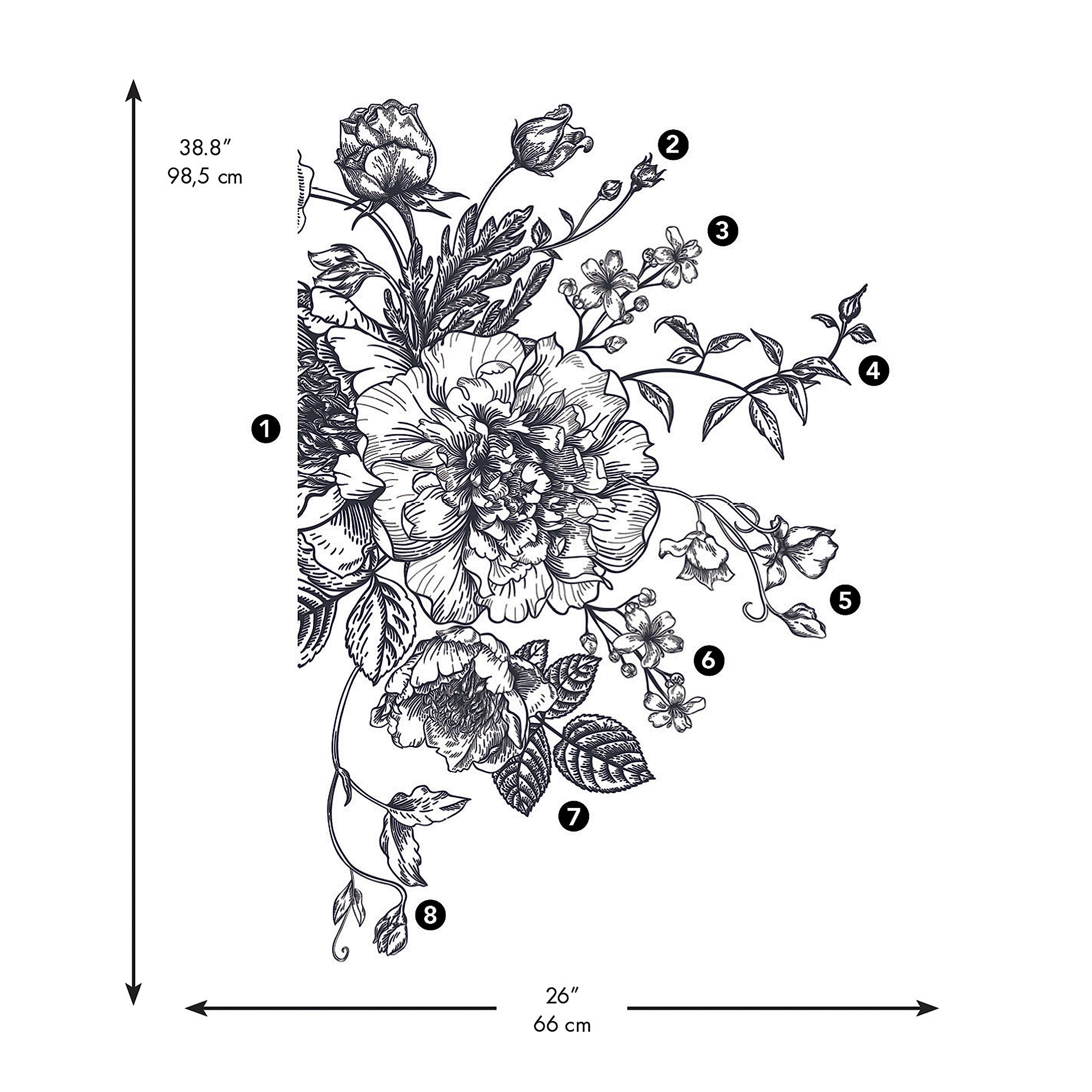 ملصقات الجدران العملاقة القابلة للإزالة من روم ميتس (RoomMates RMK3865GM) بتصميم الفاونيا الأسود والأبيض. تتميز هذه الملصقات بتصميم أزهار فاونيا كبيرة باللونين الأسود والأبيض